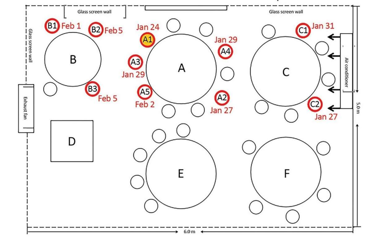 A pranzo, i cinque membri della famiglia, quelli intorno al tavolo A, erano apparentemente sani. Ma più tardi, una di loro, una donna di 63 anni, è risultata positiva al coronavirus. Entro le due settimane successive, altri nove clienti del ristorante risultarono positivi. Quattro erano parenti della prima donna infetta e forse hanno contratto il virus in altre occasioni ma per le altre cinque persone il ristorante sembrerebbe essere stato il luogo del contagio.