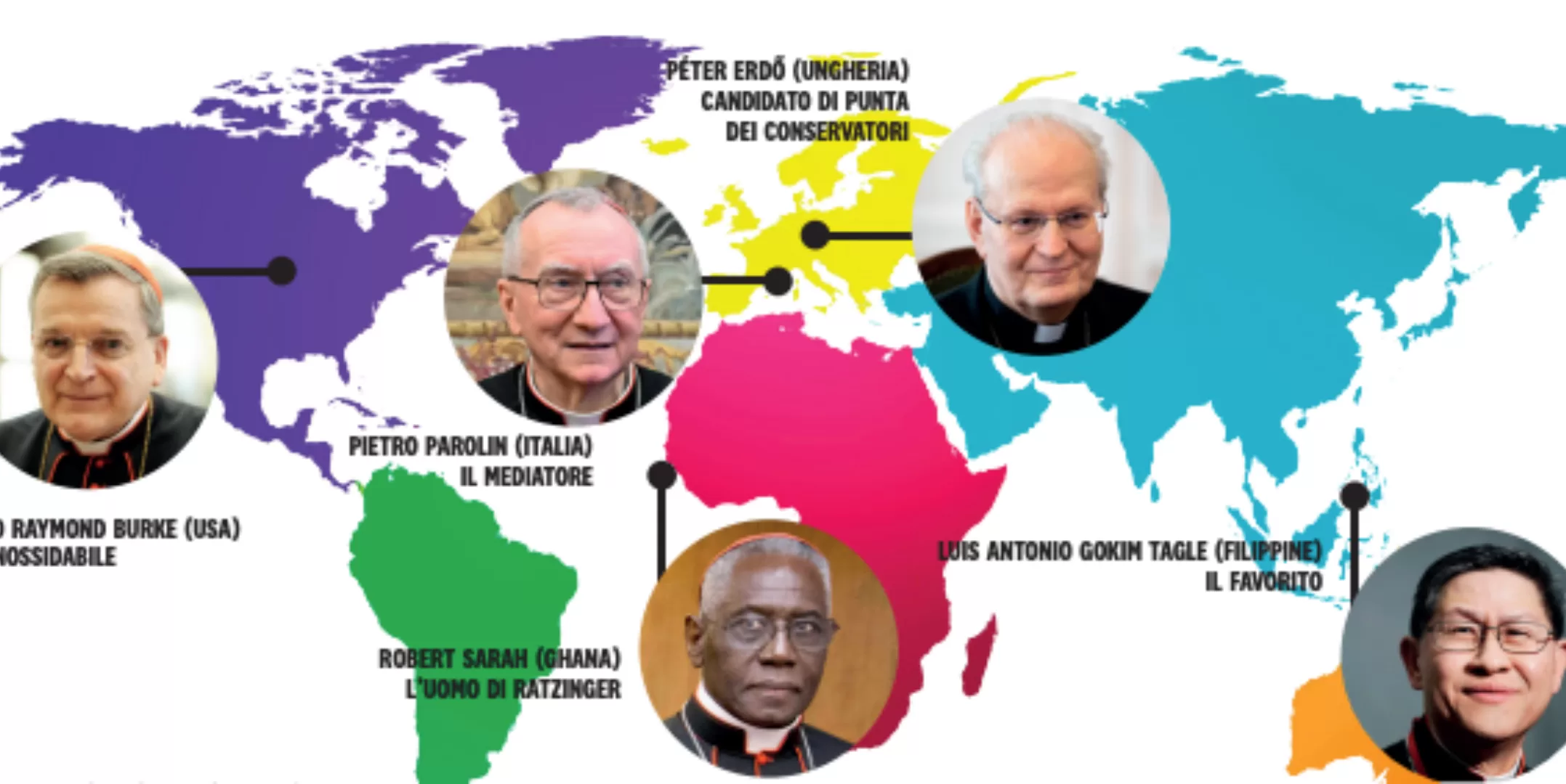 Non è un mistero per esempio che i conservatori americani scottati dall’appoggio dato a Bergoglio nel 2013 questa volta puntino su un profilo come Leo Raymod Burke, che ha nel proprio cognome l’essenza del conservatorismo, e che Donald Trump gradirebbe, cosa che però rischia di rappresentare un freno per la candidatura di Burke, anche se il tema dell’obolo di San Pietro dalle donazioni americane non è argomento da sottovalutare. Così come sempre sul fronte conservatore resta salda la figura dell’arcivescovo di Budapest Péter Erdö. Sul fronte vicino al defunto pontefice da sempre favorito è il Filippino Tagle, mentre resta in ballo una figura d’equilibrio e chissà di transizione come Pietro Parolin. In corsa anche il guineano Robert Sarah, l’uomo di Ratzinger.