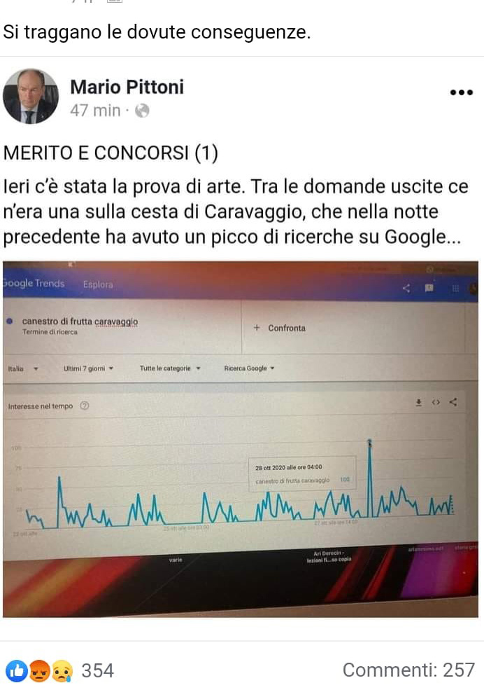 Un’ennesima ombra sta oscurando in queste ore il tanto atteso e discusso Concorso Straordinario per l’insegnamento. Le prove concorsuali sono iniziate regolarmente il 22 ottobre e sono ancora in corso, per concludersi a metà Novembre. Alcuni candidati che hanno già sostenuto la prova per la loro classe di concorso, tuttavia, denunciano via social strani picchi notturni di ricerca sul web di alcune parole chiave specialistiche, comparse poi il giorno dopo tra le domande della prova concorsuale. Questo il messaggio pubblicato sulla sua pagina facebook dal senatore leghista Mario Pittoni, vicepresidente della Commissione Cultura a palazzo Madama, che ha subito scatenato un’ondata di polemiche e commenti sui social: “Ieri c’è stata la prova di arte. Tra le domande uscite una era sulla Canestra di Caravaggio, che nella notte precedente ha avuto un picco di ricerche su Google…”, scrive Pittoni su Facebook.