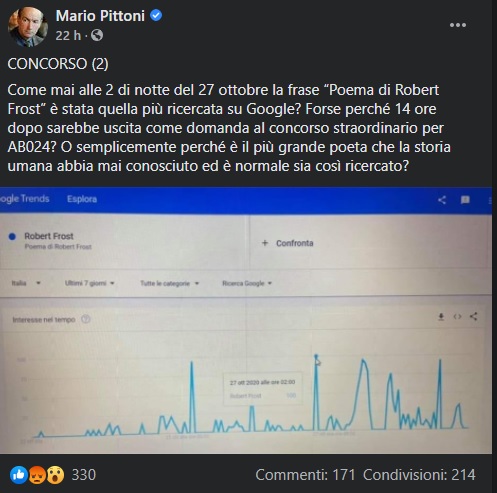 Pittoni incalza, riportando un altro caso sospetto, relativo ad un’altra classe di concorso: “Come mai alle 2 di notte del 27 ottobre la frase “Poema di Robert Frost” è stata quella più ricercata su Google? Forse perché 14 ore dopo sarebbe uscita come domanda al concorso straordinario per AB024? O semplicemente perché è il più grande poeta che la storia umana abbia mai conosciuto ed è normale sia così ricercato?”, continua Pittoni su Facebook.