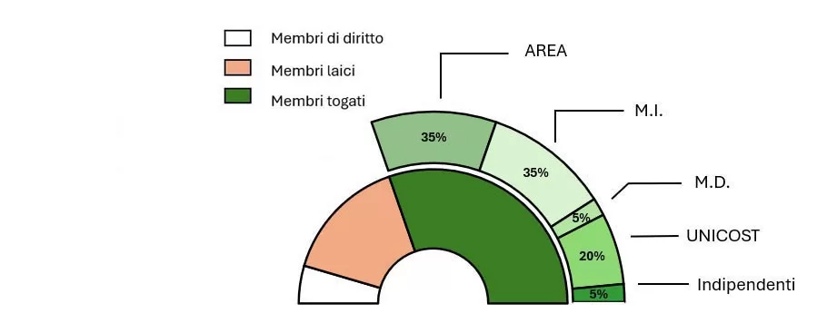 Nella composizione attuale, i membri togati appartengono in numero maggiore ad Area Democratica Per La Giustizia, la corrente progressista di centro-sinistra, e Magistratura Indipendente, la corrente di destra e la più conservatrice della magistratura. Seguono Unicost, la corrente moderata, ma con uno sguardo preferenziale ad alleanze di centro-sinistra, e Magistratura Democratica, la storica corrente di sinistra e quella maggiormente identificata come composta dalle “toghe rosse”. Solo un magistrato, A. Mirenda, tra gli indipendenti, ovvero coloro che non si identificano in nessuna corrente (se non si conta R. Fontana, magistrato eletto come indipendente ma iscritto ad Area).