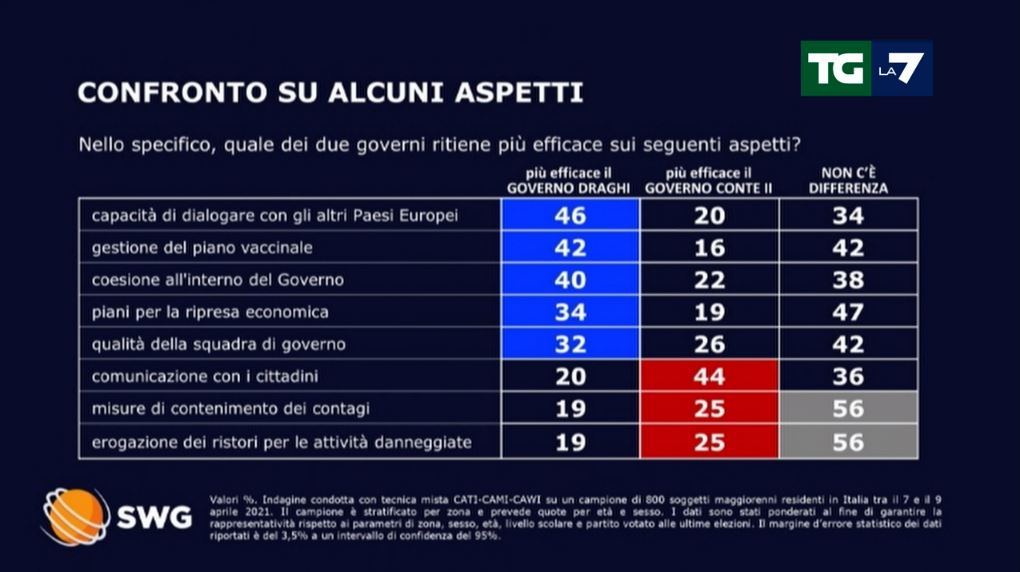 Draghi piace anche per i suoi “piani per la ripresa economica” e per la “qualità complessiva della squadra di governo”, ma viene battuto da Conte nella “comunicazione con i cittadini”, dove gli intervistati – forse memori delle dirette via streaming dai canali ufficiali social – hanno preferito al 44% l’ex premier. Il futuro leader del M5s convince anche per “misure di contenimento dei contagi” e “erogazione dei ristori per le attività danneggiate”, anche se in questi ultimi due ambiti la maggioranza assoluta del campione (56%) ritiene che non ci sia nessuna differenza.