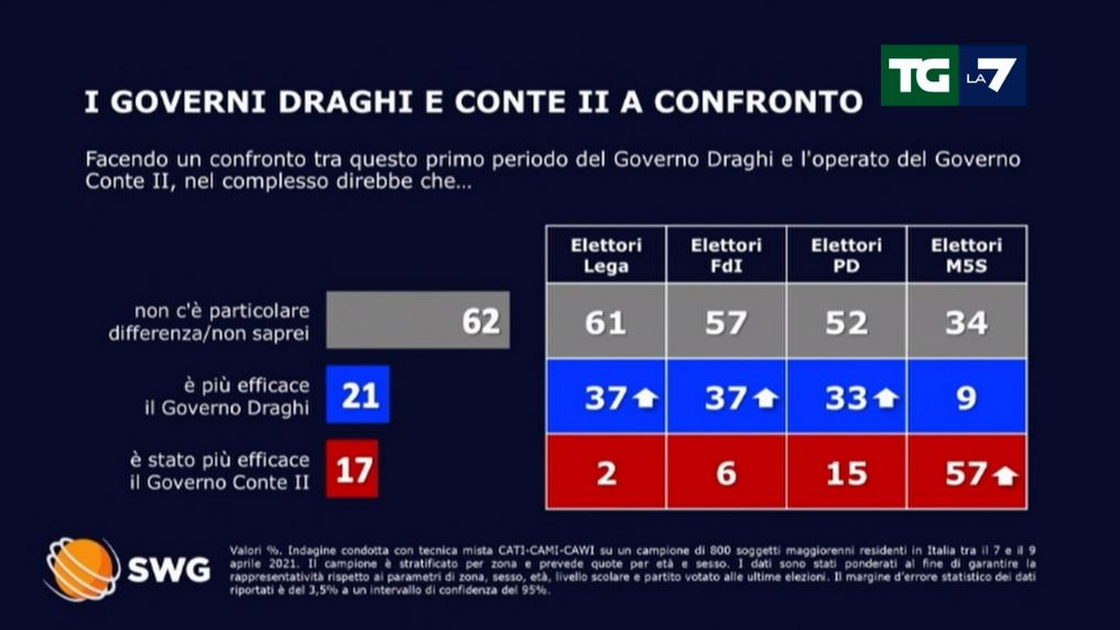 A due mesi dall’insediamento del governo Draghi, per la maggior parte degli italiani “non c’è una particolare differenza” rispetto al Conte bis. È quanto emerge dall’ultimo sondaggio Swg per La7, secondo il quale il 62% degli intervistati il passaggio della campanella non ha segnato un cambiamento radicale nella gestione del Paese.