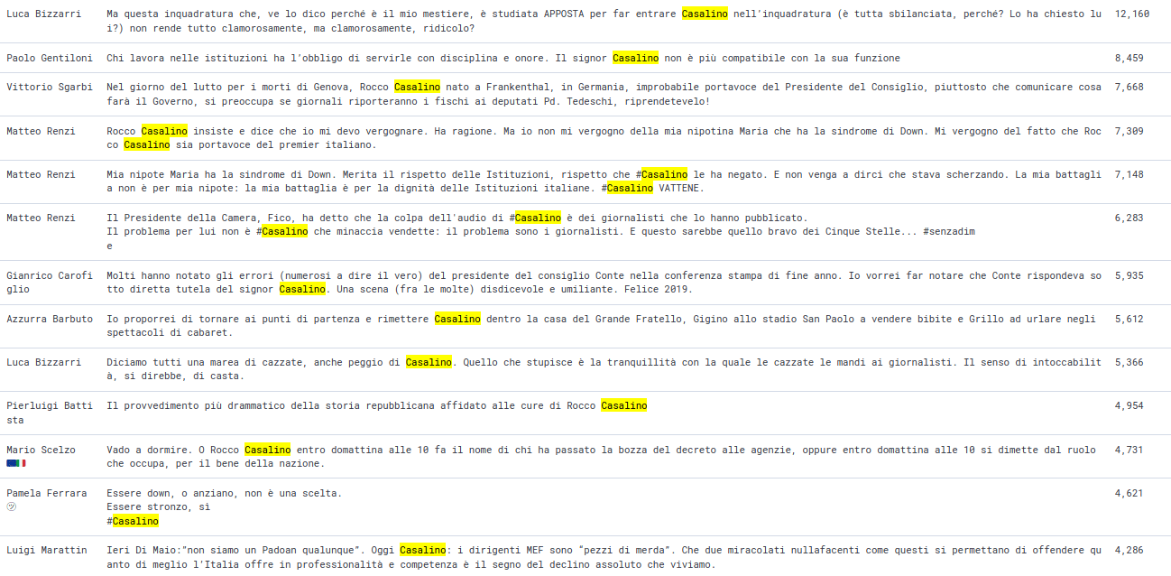 Quelli che hanno preso più like nominando Casalino non l’hanno fatto perché sono stati dolci di sale anzi. Luca Bizzarri nel giugno 2020 si domanda “a questa inquadratura che, ve lo dico perché è il mio mestiere, è studiata APPOSTA per far entrare Casalino nell’inquadratura (è tutta sbilanciata, perché? Lo ha chiesto lui?) non rende tutto clamorosamente, ma clamorosamente, ridicolo?”, mentre tra l’agosto ed il settembre 2018 Paolo Gentiloni e Vittorio Sgarbi hanno colpito il protavoce di Conte sulla spinosa questione del crollo del Ponte Morandi. Chi ha invece fatto enplein contro Casalino scendendo anche sul personale è Matteo Renzi con tre tweets acclamati dal pubblico dove non le manda a dire “Rocco Casalino insiste e dice che io mi devo vergognare. Ha ragione. Ma io non mi vergogno della mia nipotina Maria che ha la sindrome di Down. Mi vergogno del fatto che Rocco Casalino sia portavoce del premier italiano.”