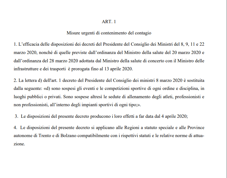 “L’unica novità che abbiamo introdotto” nel dpcm che ripropone il medesimo regime di disciplina attualmente vigente fino al 13 aprile, “riguarda le sedute di allenamento degli atleti: le sospendiamo onde evitare che le società sportive possano pretendere prestazioni sportive anche sotto forma di allenamento”. Così il presidente del Consiglio, Giuseppe Conte, in conferenza stampa a Palazzo Chigi. “Questo non significa che gli atleti non si dovranno più allenare: lo faranno in forma individuale”, ha aggiunto Conte.