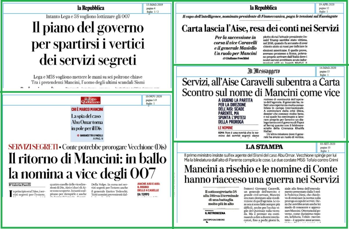 Innanzitutto la questione Mancini. Almeno dal 2019 i più informati giornalisti di questioni riguardanti l’intelligence avevano scritto più volte che a voler dare una promozione a Mancini nei servizi erano il presidente Conte in persona e il suo più stretto collaboratore, il direttore del Dis Vecchione. Il 15 maggio 2019 Carlo Bonini su “Repubblica”, in un articolo dal titolo “Il piano del governo per spartirsi i vertici dei servizi segreti”, racconta come Conte, con il sostegno dell’allora sottosegretario M5s Tofalo e dell’allora vicepremier Salvini, stesse lavorando per nominare Mancini vicedirettore dell’Aise. Il 19 aprile 2020, sempre su “Repubblica”, Giuliano Foschini in un articolo sull’addio del generale Carta all’Aise (passato a Finmeccanica) parla ancora del possibile ruolo di vicedirettore Aise per Mancini. Il 14 maggio 2020 Cristiana Mangani su “Il Messaggero” parla dello “scontro sul nome di Mancini come vice”, nomina per la quale “non tutta la maggioranza si è trovata d’accordo”. Il 3 settembre 2020 esce sulla “Stampa” un articolo a firma Jacopo Iacoboni, dal titolo “Mancini a rischio e le nomine di Conte hanno riacceso una guerra nei Servizi”. Occhiello: “Il primo ministro insiste sull’ex agente del Sismi del caso Abu Omar. Vecchione spinge per lui”.