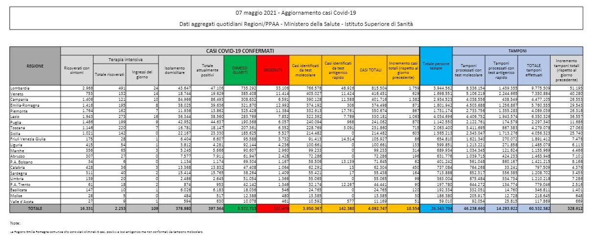 Per quanto riguarda la campagna vaccinale a oggi sono oltre 38 milioni e 391mila le dosi somministrate in Italia, per un totale di oltre 13 milioni di persone che hanno completato il ciclo vaccinale, il 24,14% della popolazione over 12 anni. Il commissario all’emergenza Francesco Paolo Figliuolo ha annunciato che l’obiettivo è quello di vaccinare l’80% della popolazione, compresi 12 e 15enni, entro settembre. Attese 20 milioni di fiale per il mese di giugno. Non è esclusa l’ipotesi di un terzo richiamo.