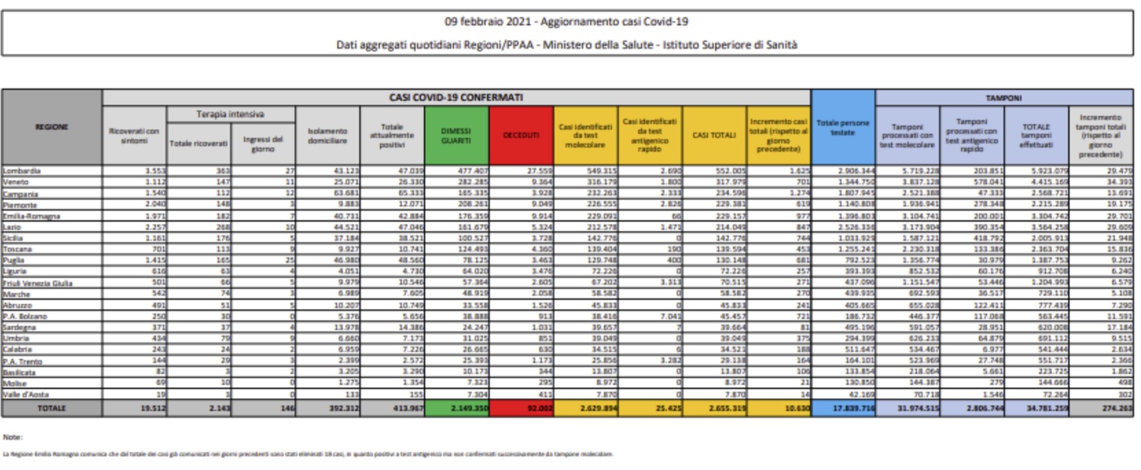 I posti letto occupati in terapia intensiva (TI) sono invariati rispetto a ieri (ieri +36), portando il totale dei malati più gravi a 2.143. Il fatto che il saldo tra i malati entrati e usciti dalla TI sia zero, non vuol dire che nessuno sia entrato nel reparto. Infatti, i nuovi ingressi in TI sono +146 (ieri +139). I cittadini vaccinati sono oltre 2,6 milioni quelli che hanno ricevuto la prima dose.