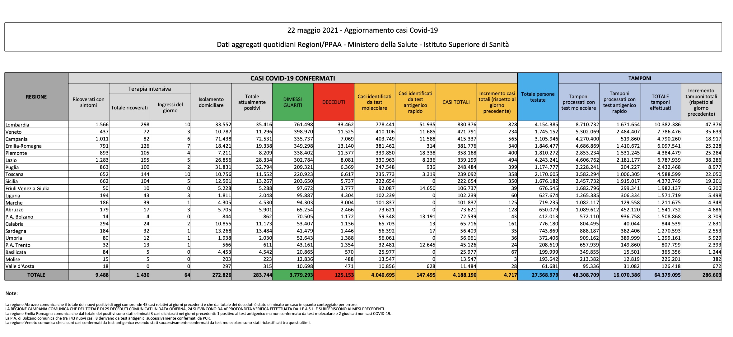 Meno contagi e meno decessi, con un tasso di positività che segna il dato migliore del 2021, da quando sono stati introdotti i test rapidi nel conteggio del valore. È quanto emerge dal bollettino di oggi, sabato 22 maggio, sull’andamento dell’epidemia di Coronavirus in Italia.