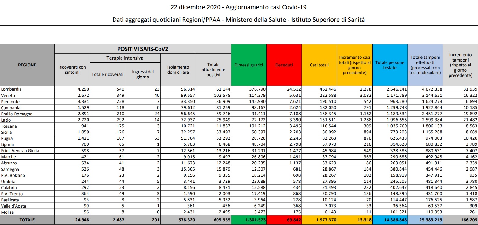 Sono 13.318 i nuovi casi di coronavirus accertati nel bollettino di martedì 22 dicembre ed emersi in seguito all’analisi di 166.205 tamponi, quasi 80mila più del giorno precedente quando i positivi sono stati 10.872. Cala bruscamente il tasso di positività che scende all’8%, più di quattro punti percentuali rispetto a ieri (12,4%).