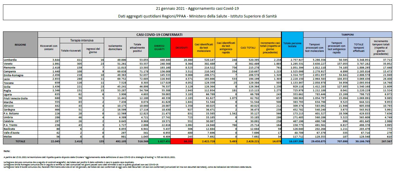 Salgono a 2.428.221 i casi totali di Coronavirus in Italia. Il numero emerge dal bollettino odierno diffuso dal Ministero della Salute, con 14.078 nuovi contagiati nelle ultime 24 ore (ieri erano 13.571). Quanto alle vittime del Covid-19, oggi sono 521 (ieri 524), per un totale di 84.202 vittime dall’inizio del monitoraggio iniziato nel febbraio dello scorso anno.