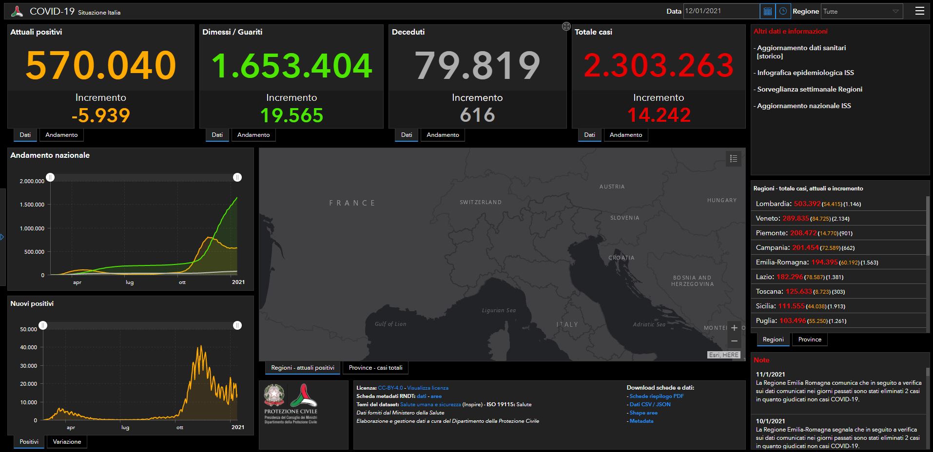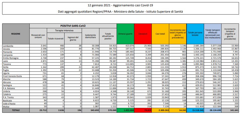 Sono 14.242 i tamponi positivi al coronavirus in Italia nelle ultime 24 ore, secondo i dati del ministero della Salute. Le vittime sono 616, per la terza volta sopra quota 600 dall’inizio del 2021. Tutti numeri in aumento rispetto al bollettino sull’epidemia pubblicato 24 ore fa, quando i positivi erano stati 12.532 e i morti 448. In totale dall’inizio dell’emergenza sono state contagiate 2.303.263 persone e ne sono morte 79.819.