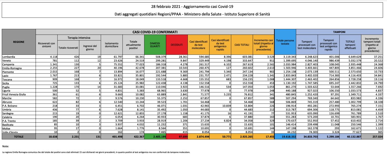 Sono 17.455 i nuovi casi di coronavirus in Italia (ieri erano +18.916). Sale così ad almeno 2.925.265 il numero di persone che hanno contratto il virus Sars-CoV-2 (compresi guariti e morti) dall’inizio dell’epidemia. I decessi odierni sono 192 (ieri erano +280), per un totale di 97.699 vittime da febbraio 2020. Mentre le persone guarite o dimesse sono 2.405.199 complessivamente: 6.847 quelle uscite oggi dall’incubo Covid (ieri +11.320). E gli attuali positivi — i soggetti che hanno il virus — risultano essere in tutto 422.367, pari a +10.401 rispetto a ieri (+7.302 il giorno prima).