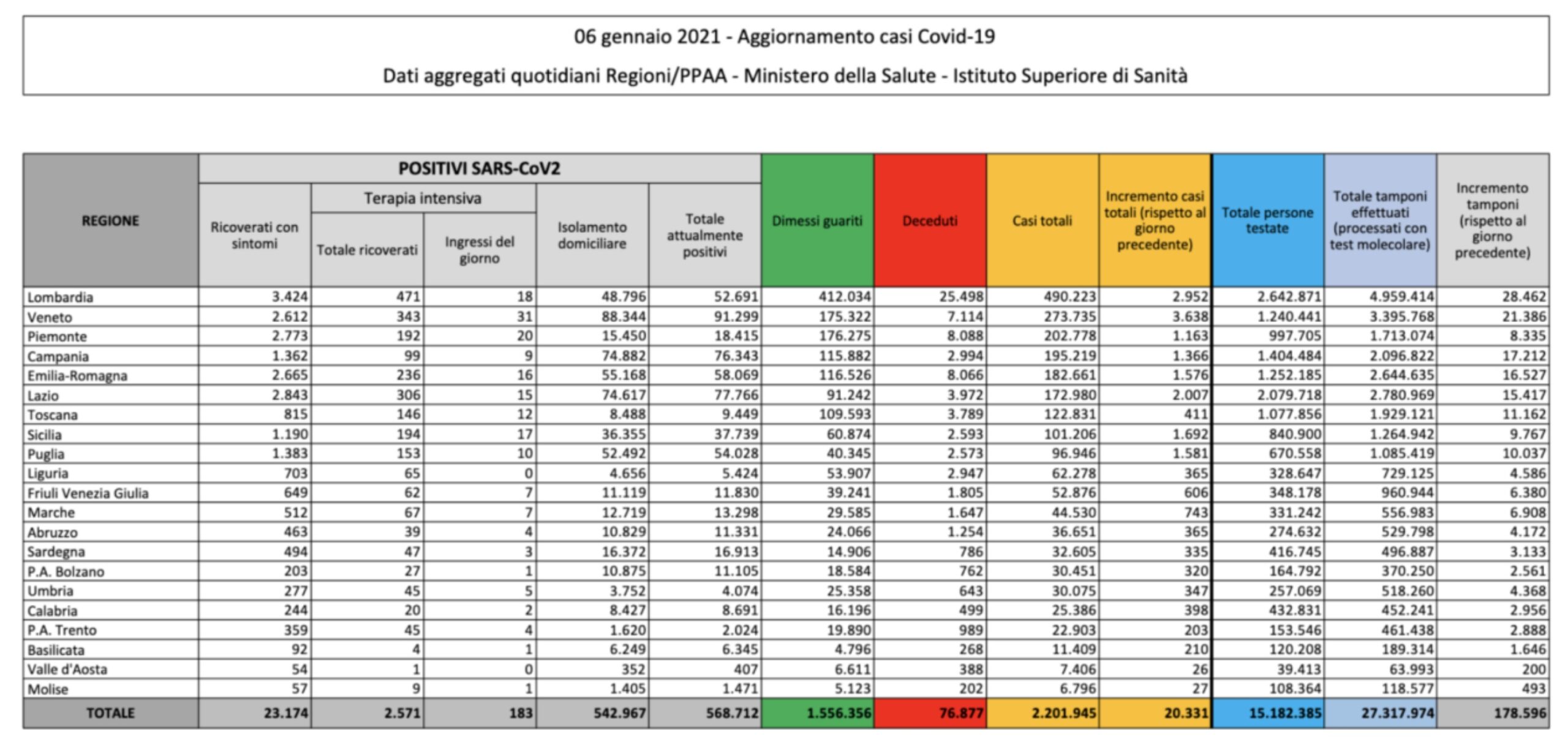La situazione negli ospedali. I posti letto occupati nei reparti Covid ordinari sono -221 (ieri +78), per un totale di 23.174 ricoverati. Mentre i posti letto occupati in terapia intensiva (TI) sono +2 (ieri -10), portando il totale dei malati più gravi a 2.571. I nuovi ingressi in TI sono +183 (ieri +202). Il maggior numero di ingressi in TI è in Veneto (+31), Piemonte (+20), Lombardia (+18), Sicilia (+17), Emilia-Romana (+16) e Lazio (+15).