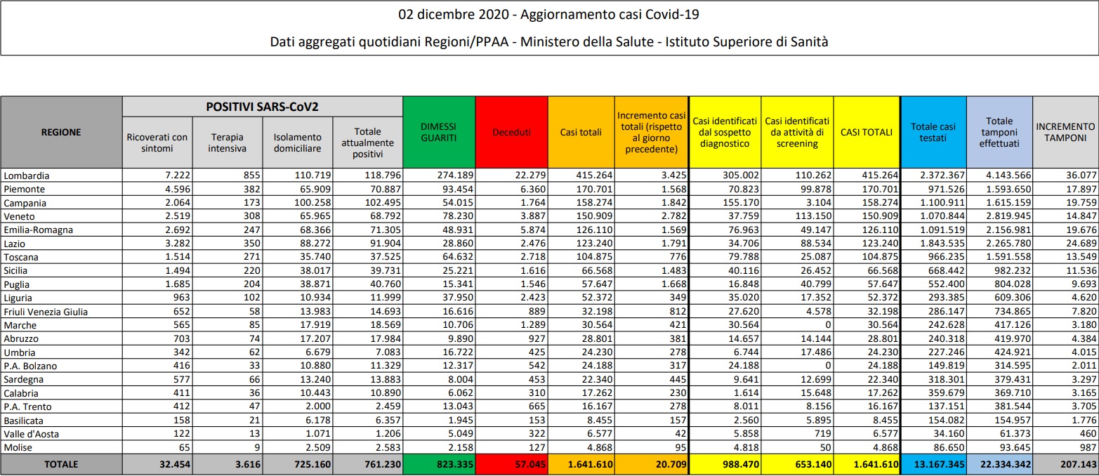 Continua a calare il tasso di positività in Italia. Nel bollettino di mercoledì 2 dicembre, diffuso dal ministero della Salute, i nuovi casi di contagio sono 20.709 emersi dall’analisi di 207.143 tamponi, 25mila più di ieri quando i positivi accertati sono stati 19.350. Un dato che porta il rapporto tamponi-contagiati al 10% (-0,6% rispetto al giorno precedente).