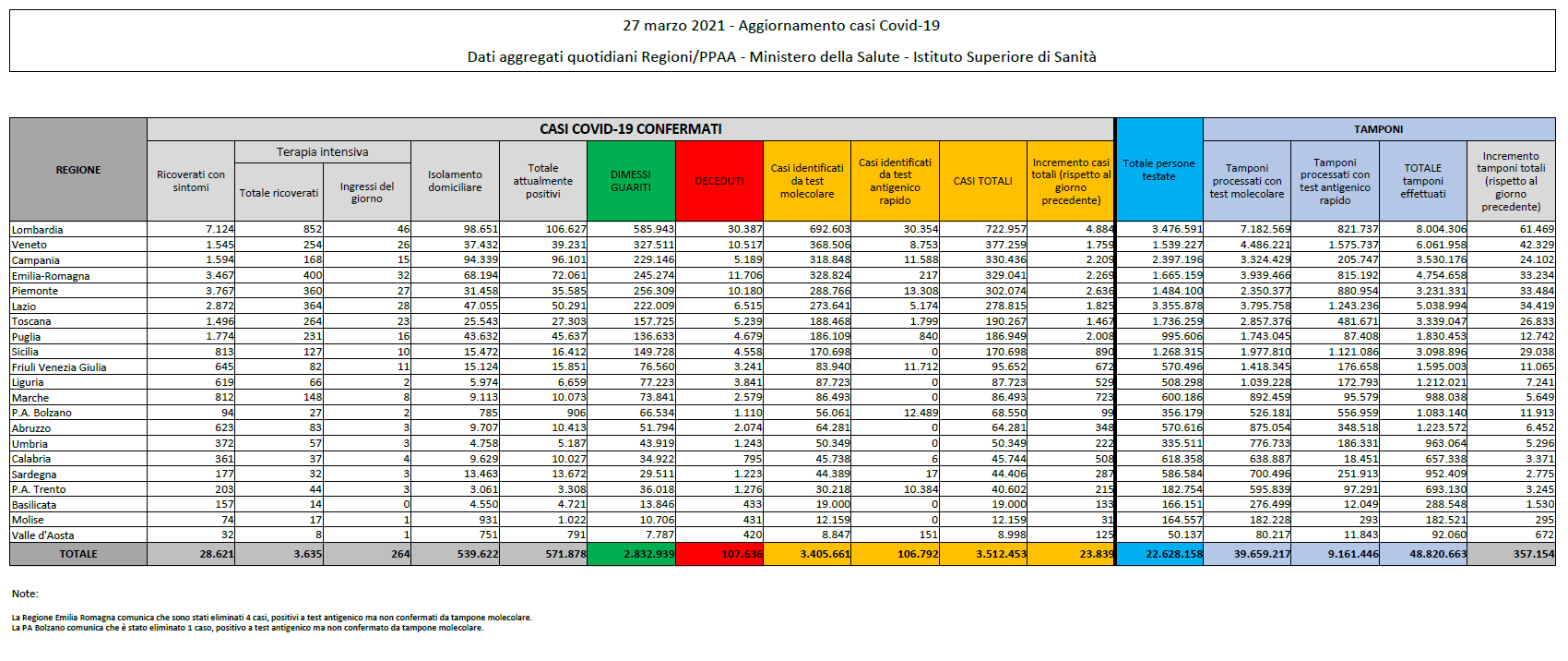 La Lombardia è la regione più colpita per numero di nuove infezioni (+4.884). Con oltre 2 mila contagiati ci sono: Piemonte (+2.636), Emilia-Romagna (+2.269), Campania (+2.209) e Puglia (+2.008). Seguono con un incremento a quattro cifre: Lazio (+1.825), Veneto (+1.759) e Toscana (+1.467). Tutte le altre regioni anno un aumento a due o tre cifre.