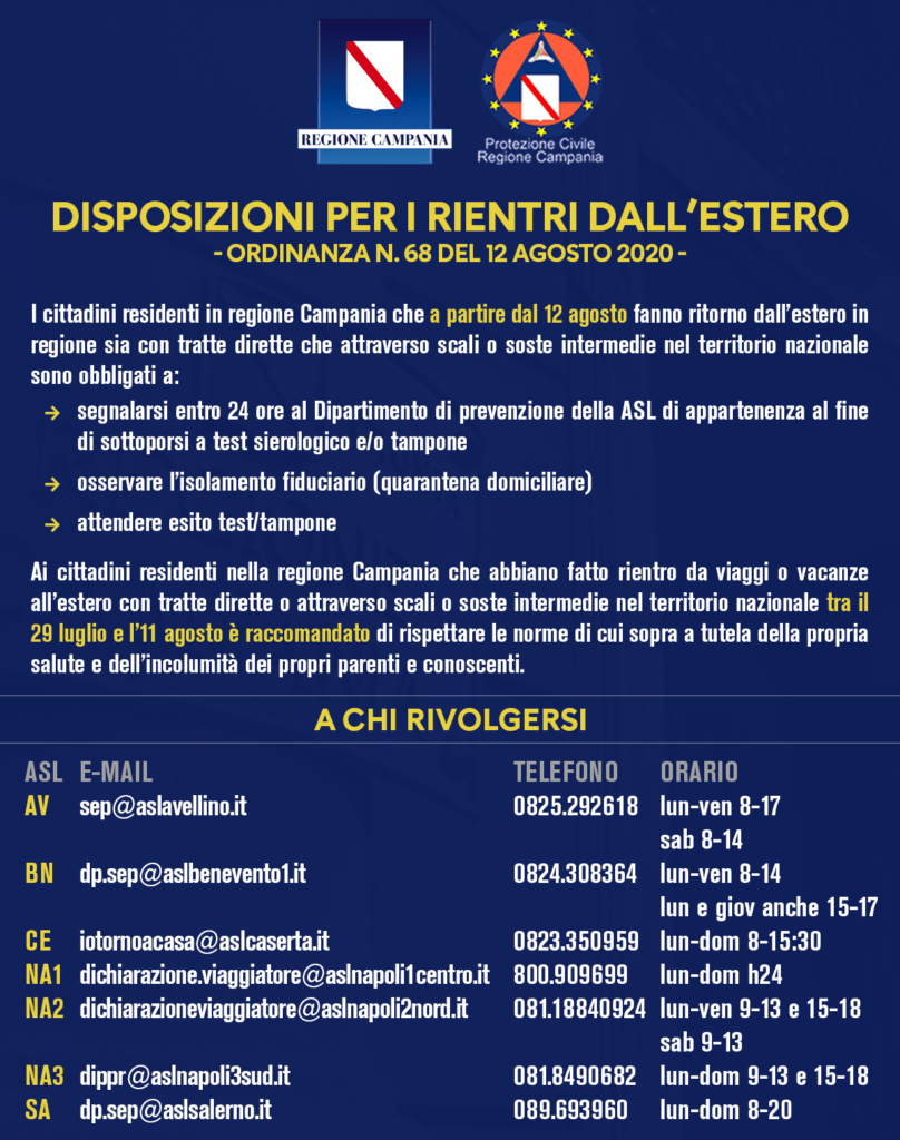 OLTRE 2300 SEGNALAZIONI DI RIENTRO – L’Unità di Crisi comunica che i dati dei rientri registrati dalle ASL nel territorio della regione Campania in attuazione della ordinanza n. 68 del 12 agosto scorso sono i seguenti: – 1.374 segnalazioni di rientro via mail – 967 segnalazioni di rientro via telefono. Totale: 2.341 segnalazioni nella giornata di oggi.
