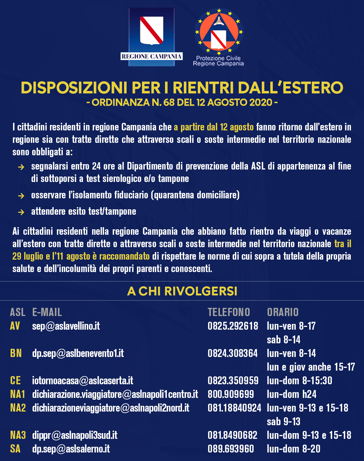 RESTATE IN ITALIA – “I turisti stranieri – che peraltro aiutano la ripresa della nostra economia – vengono controllati negli aeroporti e alle frontiere. Inoltre vengono ulteriormente controllati negli alberghi e nelle strutture di accoglienza e non hanno ovviamente relazioni capillari con le nostre comuntà. I nostri concittadini partiti per lavoro o per vacanza, quando rientrano, hanno ovviamente attività di relazioni ampie e incontrollate con familiari, conoscenti, amici e possono dunque diventare agenti imprevedibili di contagio, come è già accaduto ripetutamente. Si ritiene utile incoraggiare in questa fase la permanenza in Italia per dare respiro alle nostre strutture turistiche. Sarebbe davvero assurdo portare risorse all’estero e importare il contagio in Italia. Ovviamente, chi certifica di aver già fatto il tampone può normalmente rientrare senza problemi. In ogni caso ci si può rivolgere all’Asl di appartenenza o al medico di famiglia – non agli ospedali – e farlo rapidamente (tabella allegata). Siamo in un momento cruciale, nel quale si decide se proseguire nel ritorno a una vita normale controllata o si debba tornare a chiusure dolorose. Si richiede pertanto ad ogni cittadino collaborazione e comprensione, per non interrompere il percorso verso la normalità”.