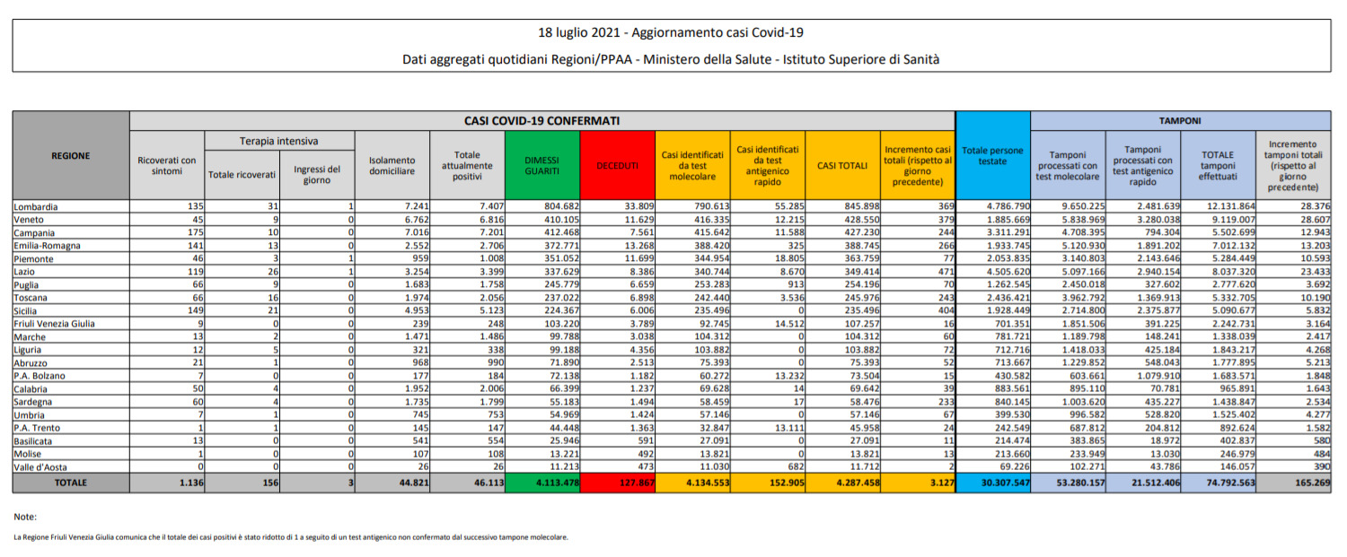 Anche oggi è il Lazio la Regione con il maggior numero di nuovi casi, sono 471 (ieri 500), seguita da Sicilia con 404 casi (ieri 431), Veneto con 379 (ieri 424) e Lombardia con 369 (ieri 438). Proprio a Roma il cluster più grande registrato in Italia: legato alla proiezione, in un pub del quartiere di Monteverde, della finale degli Europei di calcio tra Italia e Inghilterra, domenica scorsa, 11 luglio. Un centinaio i positivi emersi finora. Un altro cluster, sempre nella capitale, a Piazza Trento, sarebbe esploso in occasione della semifinale tra Italia e Spagna.