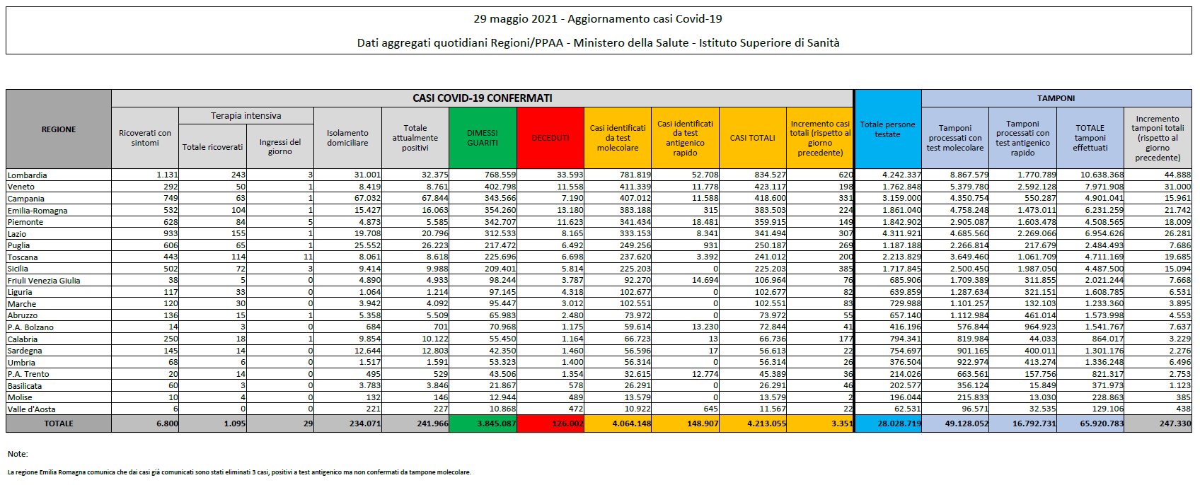 I dati odierni dei nuovi contagi continuano ad essere incoraggianti. Sono 3.351 i nuovi casi di coronavirus in Italia (ieri sono stati +3738). Sale così ad almeno 4.213.055 il numero di persone che hanno contratto il virus Sars-CoV-2 (compresi guariti e morti) dall’inizio dell’epidemia.