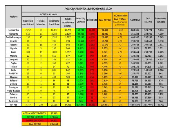 Il numero complessivo dei dimessi e guariti sale invece a 174.865, con un incremento di 1.780 persone rispetto a ieri.