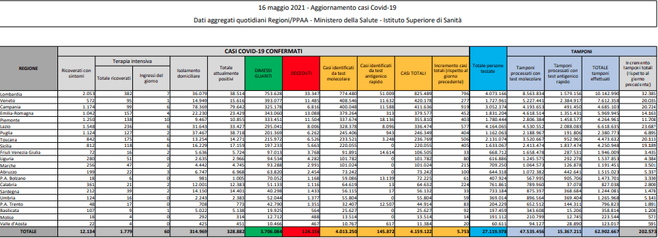 Riguardo la campagna vaccinale, ad oggi sono 27.131.857 gli italiani che hanno ricevuto almeno la prima dose (dato aggiornato alle 17.13 del 16 maggio). Quelli che hanno invece terminato il ciclo vaccinale sono 8.531.894, pari al 14,40% della popolazione.