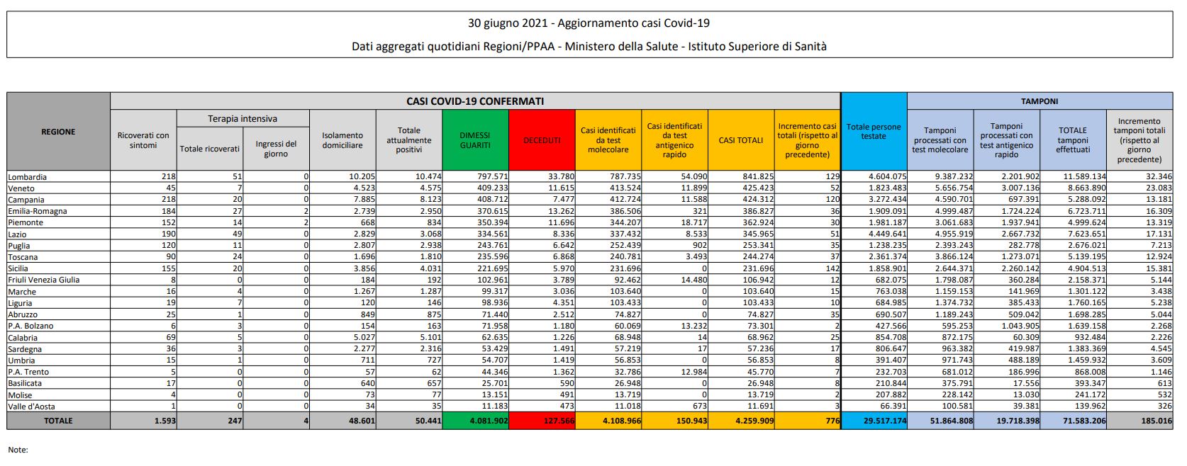 Le Regioni che hanno registrato il maggior numero di nuovi casi giornalieri sono Sicilia (+142), Lombardia (+129), Campania (+120), Veneto (+52), Lazio (+51), Toscana (+37), Emilia-Romagna (+36). L’Italia al momento è interamente Zona Bianca. Da lunedì 28 giugno la mascherina non è più obbligatoria all’aperto. Non è esclusa la creazione di Zone Rosse qualora dovessero aumentare i contagi localmente. A preoccupare è infatti la Variante Delta, che sfiora il 17% anche se al momento il sequenziamento procede a rilento. La variante è più trasmissibile delle altre ma risulta coperta efficientemente dal ciclo completo di vaccini. A oggi sono oltre 51 milioni 194mila le somministrazioni condotte in Italia, più di 18 milioni e 530mila le persone che hanno completato il ciclo, il 34,31% della popolazione over 12.