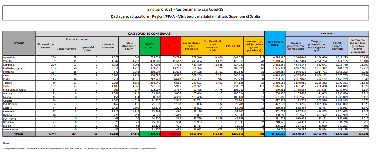 Sono 782 i nuovi positivi al coronavirus emersi nelle ultime 24 ore e 14 le vittime per le complicanze dell’infezione. Il dato nel bollettino quotidiano dell’emergenza covid-19. Il totale dei positivi dall’inizio dell’emergenza sale così a 4.258.069, quello delle vittime a 127.472.