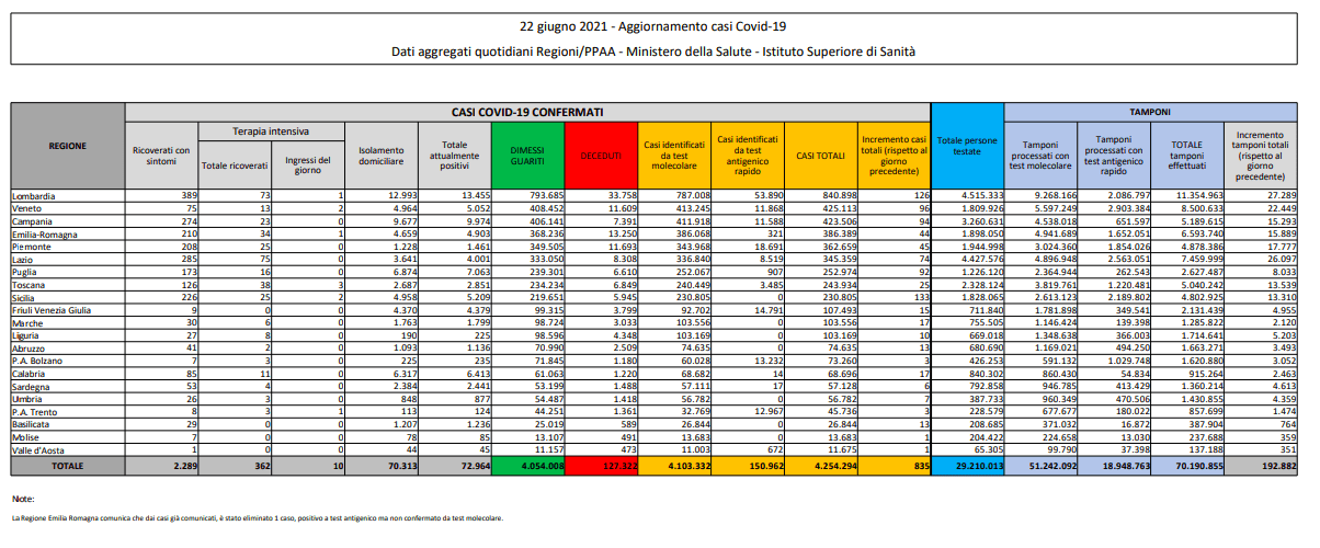 L’Italia è quasi interamente in Zona Bianca intanto, ovvero nell’area a minor rischio di contagio. Soltanto la Valle d’Aosta è in Zona Gialla. Dovrebbe passare in Bianca lunedì 28 giugno, quando sarà revocato l’obbligo di uso della mascherina all’aperto e in assenza di assembramenti. Per quanto riguarda la campagna vaccinale oggi le somministrazioni condotte in Italia sono oltre 46 milioni e 812mila, per un totale di oltre 16milioni e 173mila persone che hanno completato il ciclo, pari al 29,95% della popolazione over 12.