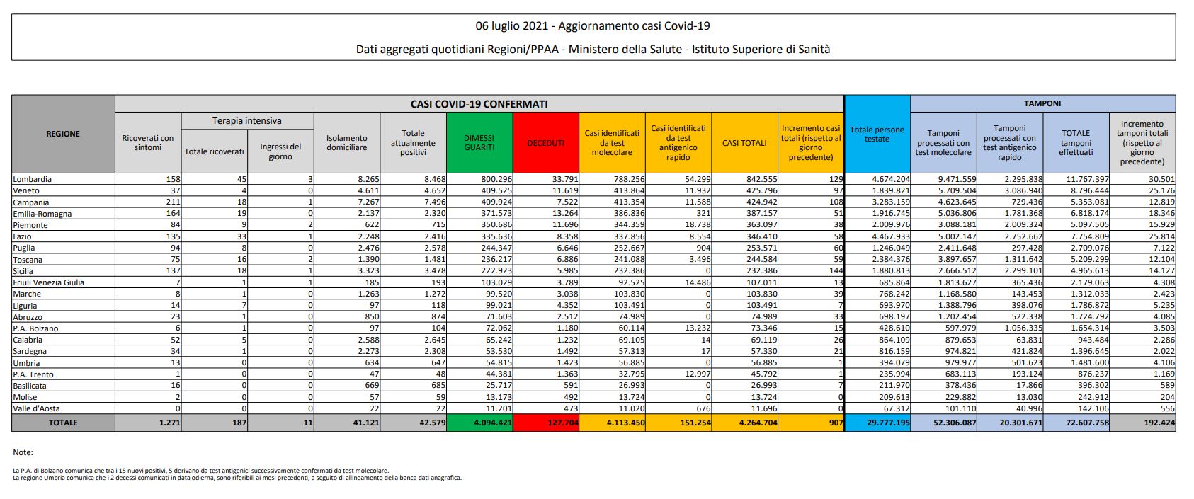 Le Regioni che hanno registrato il maggior numero di nuovi casi giornalieri sono Sicilia (+144), Lombardia (+129), Campania (+108), Veneto (+97), Puglia (+60), Toscana (+59), Lazio (+58). Il totale delle somministrazioni condotte in Italia a oggi è superiore a 54 milioni e 602mila, il totale delle persone vaccinate sale oltre i 21 milioni e 374mila. Anche se la variante Alfa resta quella predominante in Italia, un report dell’Istituto Superiore di Sanità ha mostrato come la variante Delta in Italia abbia raggiunto una prevalenza del 22,7%, con picchi del 35% e 56% rispettivamente in Lazio e Abruzzo. È stata identificata in 16 Regioni.