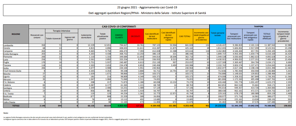 Per quanto riguarda la campagna vaccinale, a oggi sono oltre 47 milioni e 373mila le somministrazioni condotte in Italia, più di 16 milioni e 457mila le persone che hanno completato il ciclo vaccinale, pari al 30% della popolazione over 12 italiana. Da lunedì sarà possibile togliere la mascherina all’aperto in mancanza di assembramenti e tutta Italia sarà in Zona Bianca con il passaggio presumibilmente della Valle d’Aosta dalla Zona Gialla.