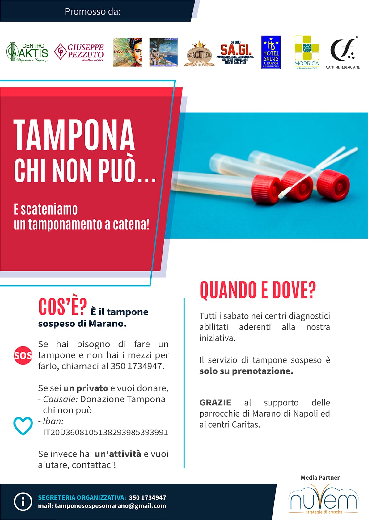 Un plauso va alle tante attività commerciali ed associazioni di Marano di Napoli che in queste ore stanno sponsorizzando il progetto fornendo carburante alla macchina di beneficenza che vuole partire presto per poter “tamponare” quante più persone possibili. “L’obiettivo è quello di scatenare un ‘tamponamento’ a catena”, recita il volantino dell’iniziativa. “L’idea del tempone sospeso è partita per sensibilizzare ed invitare le persone a fare lo screening – spiegano gli organizzatori dell’iniziativa – Purtroppo da tempo viviamo sul territorio rallentamenti delle Usca e quindi noi ci inseriamo per diagnosticare positività e/o negatività delle persone che hanno difficoltà economica”.