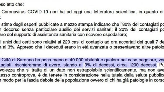 Nel documento si leggeva infatti che “la città di Saronno ha poco meno di 40.000 abitanti e qualora nel caso peggiore, venissero tutti contagiati, rischieremmo di avere, stando al 3% di decessi, circa 1200 decessi”. Una casistica di fatto impossibile che ha provocato un polverone di politiche, tanto da costringere il primo cittadino leghista a fare un passo indietro. Nella stessa ordinanza il Comune scriveva infatti che “pur nella consapevolezza che si tratta di un dato non estrapolabile scientificamente, ma non avendo al tempo stesso controprove, è da tenere in considerazione nella tutela della salute pubblica ed in particolar modo per la fascia debole della popolazione ovvero di chi ha già patologie in corso”.