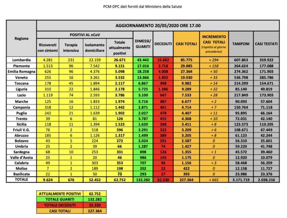A oggi il totale delle persone che hanno contratto il virus è di 227.364, con un incremento rispetto a ieri di 665 nuovi casi. Il numero complessivo dei dimessi e guariti sale invece a 132.282, con un incremento di 2.881 persone rispetto a ieri.