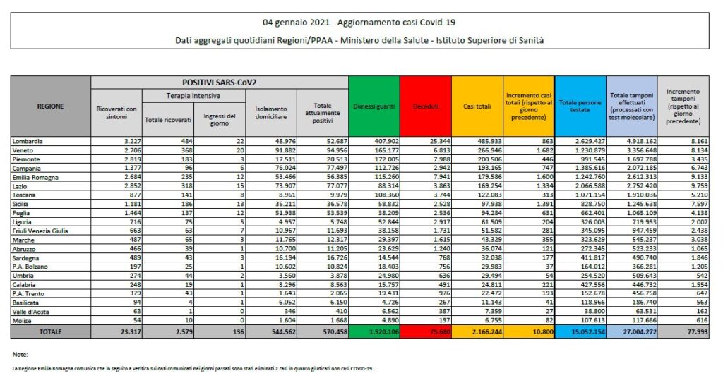 Le persone guarite e dimesse sono 1.520.106 dall’inizio del monitoraggio partito lo scorso febbraio. Gli italiani attualmente positivi al virus sono invece 570.458, pari a -5.756 rispetto a ieri: di questi 23.317 sono ricoverati con sintomi (ieri erano 23.075), 2.579 si trovano in terapia intensiva (ieri erano 2.583) e 544.562 sono sottoposti a isolamento domiciliare.