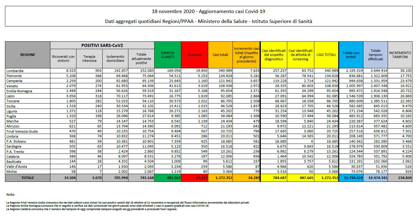 Quanto ai dati sulle singole regioni, il maggior incremento di nuovi contagi viene registrato ancora una volta in Lombardia (7.633), seguita da Campania (3.657), Piemonte (3.281), Veneto (2.972), Lazio (2.866), Toscana (2.508), Emilia Romagna (2.371), Sicilia (1.837) e Puglia (1.369).