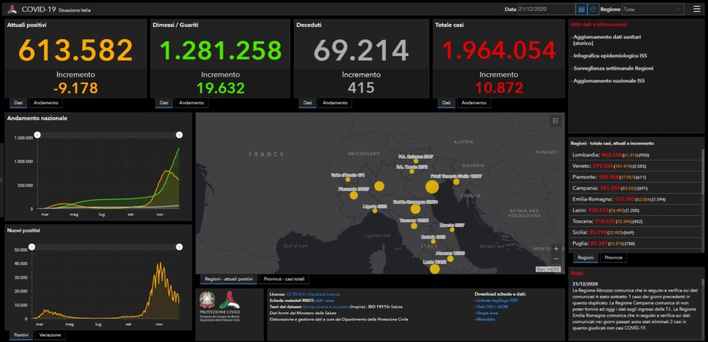 Sono poco più di 10mila, per la precione 10.872, i nuovi casi di coronavirus individuati in Italia nelle ultime 24 ore, per un totale dall’inizio dell’emergenza di 1.964.054. E’ invece di 415 l’incremento delle vittime in un giorno, che porta il totale a 69.214. E’ quanto emerge dal bollettino odierno diffuso dalla Protezione civile e Ministero della Salute sull’andamento dell’epidemia di Coronavirus in Italia.