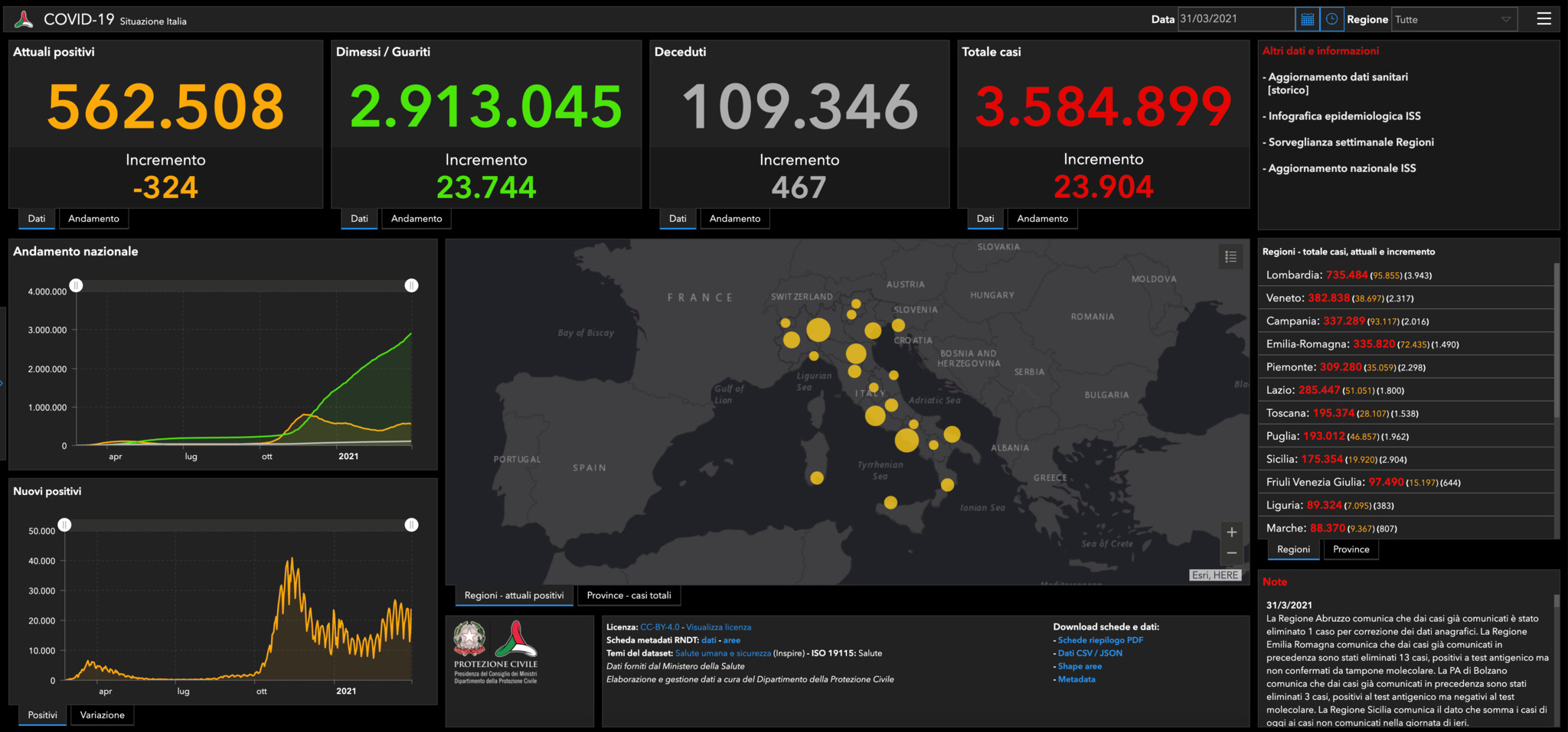 In totale i casi da inizio epidemia sono 3.584.899, gli attualmente positivi sono 562.508 (-324 rispetto a ieri), i guariti e dimessi 2.913.045 (+23.744), in isolamento domiciliare ci sono 529.618 persone (-267).