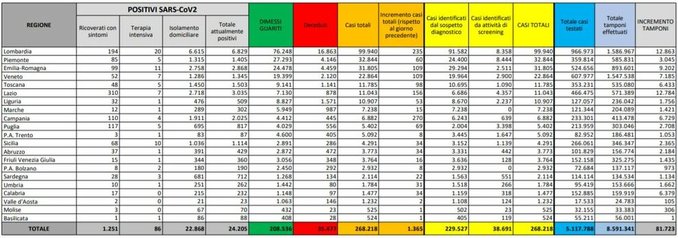 I tamponi condotti sono stati 81.723 per un totale di 8.591.341. I dimessi e guariti da ieri sono stati 312. Gli attualmente positivi sono 24.205. Il totale dei positivi sale così a 268.218, dei morti a 35.477, dei guariti a 208.536.