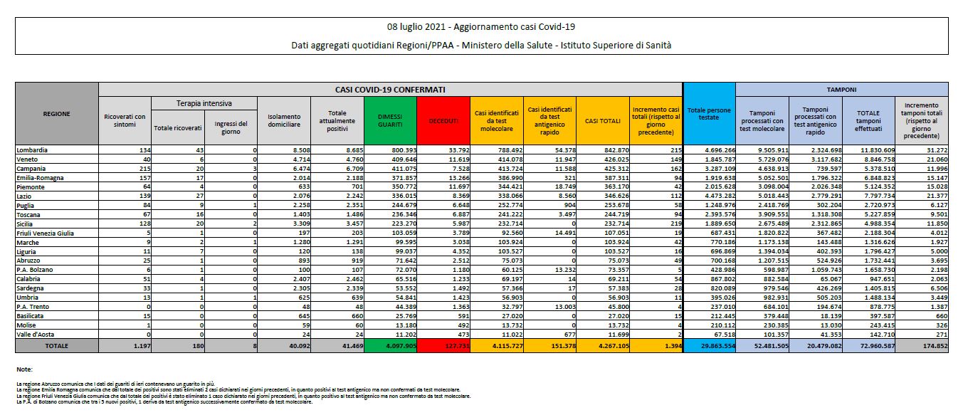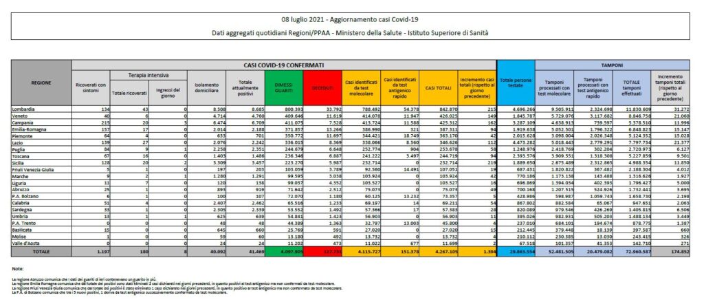 Complessivamente salgono a 4.097.905 le persone guarite o dimesse, di cui 1.749 tra mercoledì e oggi. Gli italiani attualmente positivi al virus sono invece 41.469, in calo di 371 unità.