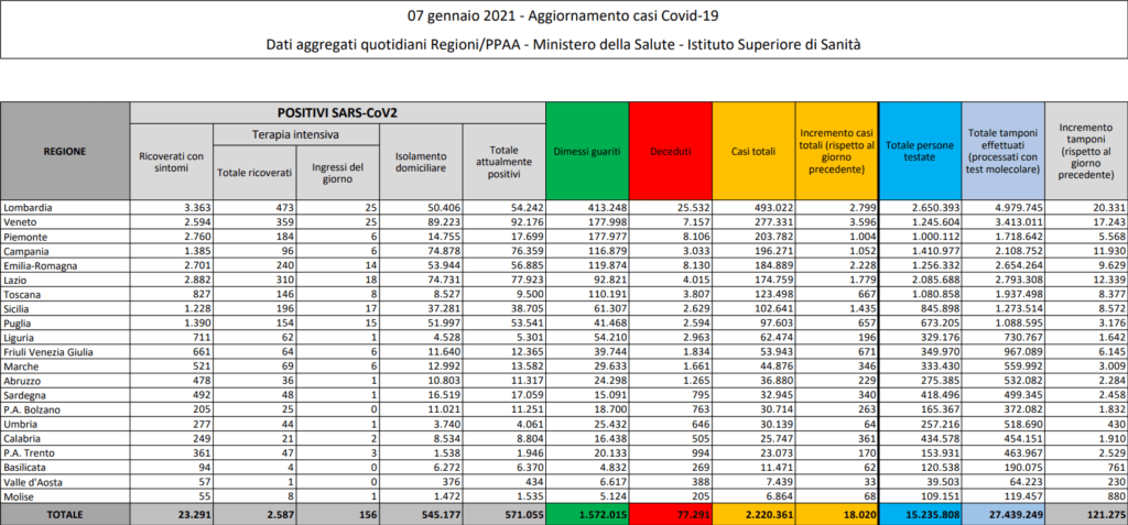 I nuovi casi accertati nel bollettino di giovedì 7 gennaio sull’emergenza coronavirus, diffuso dal Ministero della Salute, sono 18.020, circa duemila in meno del giorno precedente (20.331) ma con meno tamponi effettuati (121.275, oltre 55mila in meno rispetto all’Epifania).