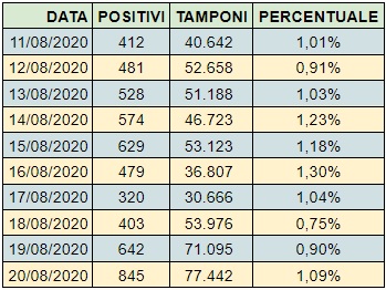 Dall’1,01% dell’11 agosto all’1,09% del 20 agosto, con picchi dell’1,23% del 14 (574 positivi su 46.723 tamponi) e minimi dello 0,75% del 18 agosto (403 positivi su 53.976 tamponi).