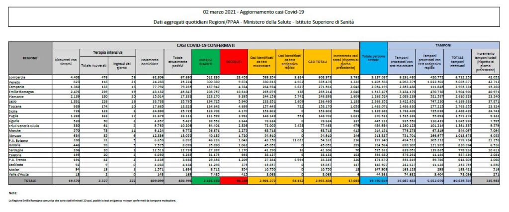 Le persone guarite o dimesse dall’inizio del monitoraggio sono invece 2.426.150 complessivamente, di cui 10.057 nelle ultime 24 ore.
