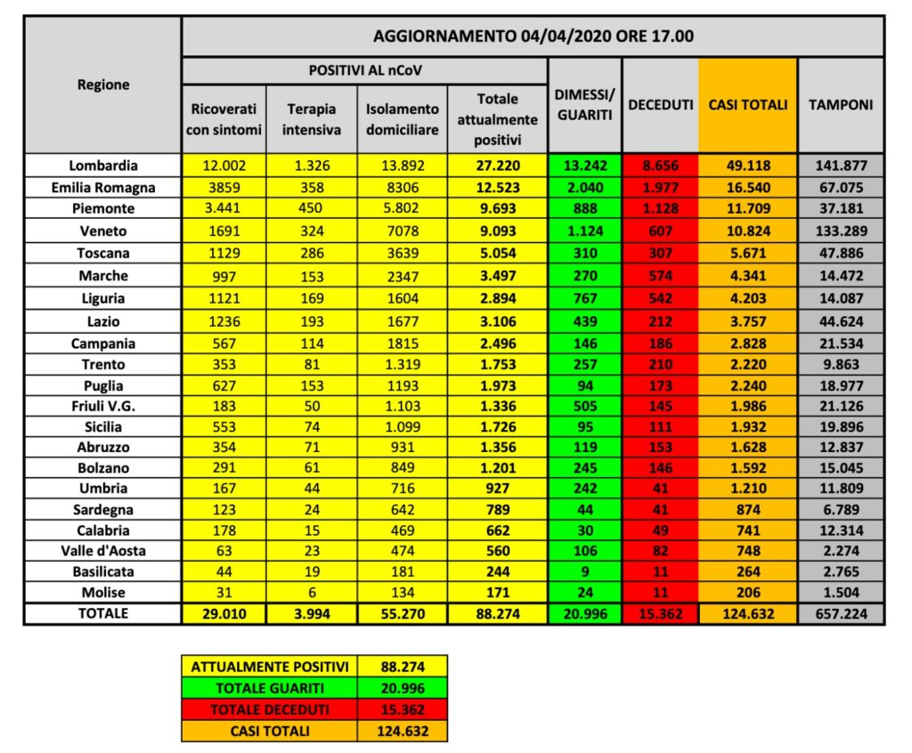 Il totale degli attualmente positivi è di 88.274, con i casi totali per Coronavirus in Italia che arrivano a 124.632, in aumento di 4805 rispetto a ieri.