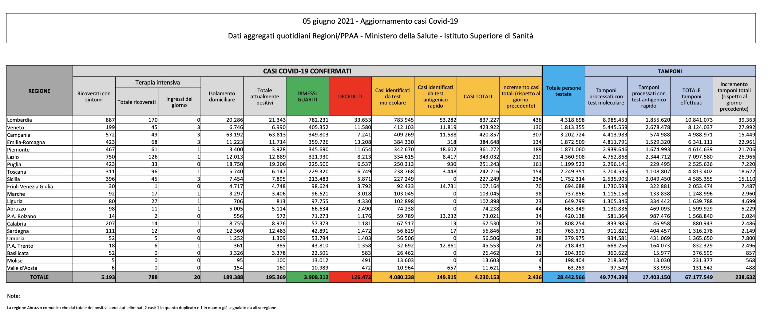 Le persone guarite o dimesse dall’inizio del monitoraggio sono 3.908.312: di queste 7.200 sono “uscite dall’incubo” nelle ultime 24 ore. Gli italiani attualmente positivi sono 195.369, in calo di 4.823 unità rispetto a venerdì.