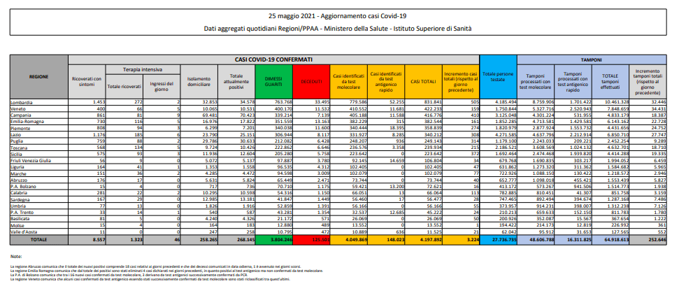 Ieri i positivi erano stati 2.490 e i morti 110. Oggi sono stati effettuati 252.646 tamponi, ieri erano stati 107.481. Il tasso di positività scende all’1,3%, in calo rispetto a ieri del 2,3%. I dimessi ed i guariti sono invece 3.804.246, con un incremento rispetto a ieri di 11.348 mentre gli attualmente positivi scendono a 268.145 (-8.294).