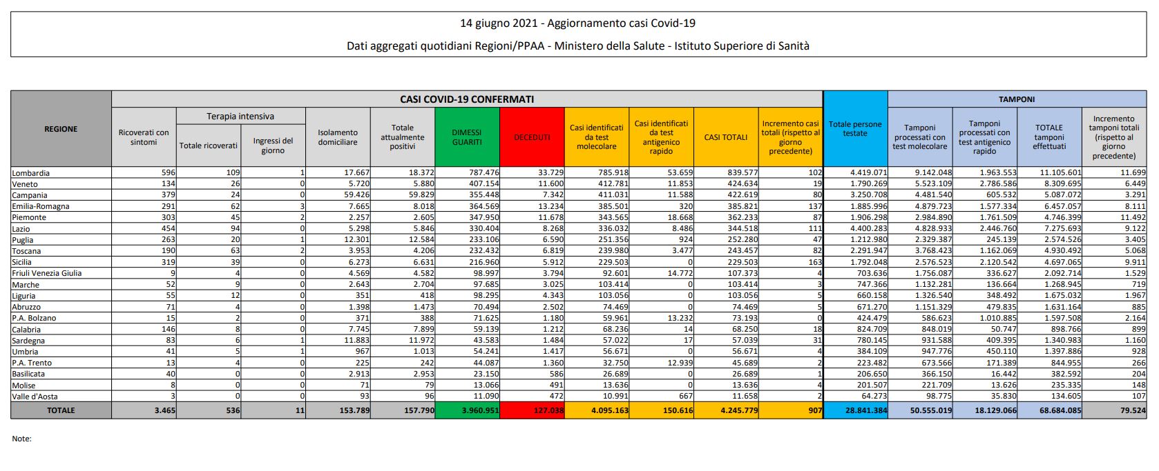 I dimessi ed i guariti sono invece 3.960.951, con un incremento di 3.394 rispetto a ieri, mentre gli attualmente positivi scendono a 157.790, in calo di 2.523 nelle ultime 24 ore. Domenica erano stati 134.136 i tamponi processati, il tasso di positività all’1%. 1.390 i contagiati e 26 i morti. Al momento sono 536 i pazienti ricoverati in terapia intensiva, con un calo di 29 rispetto a domenica nel saldo quotidiano tra entrate e uscite. Gli ingressi giornalieri, secondo i dati del ministero della Salute, sono stati 11 (domenica erano stati 20). I ricoverati con sintomi nei reparti ordinari sono 3.465, in calo di -77 unità rispetto a domenica.