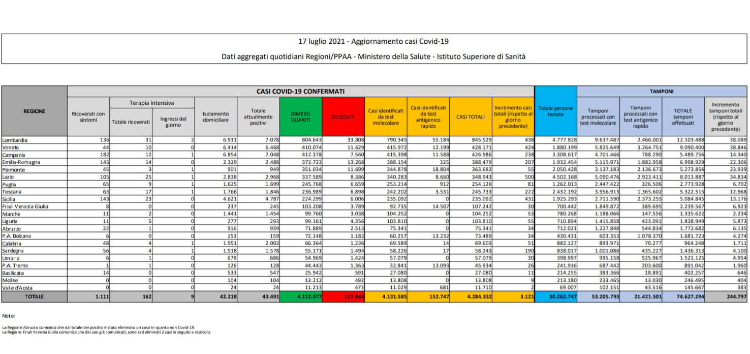 I dimessi ed i guariti sono invece 4.112.977, con un incremento di 2.328 rispetto a ieri. Le persone in isolamento domiciliare sono 42.218 (+753). In lievissima crescita il numero di ricoverati in terapia intensiva, sono 162 contro i 161 di ieri, ma in calo il numero di ingressi giornalieri, sono infatti 9 contro i 13 di ieri. In aumento i ricoveri nei reparti ordinari, sono oggi 1.111 contro i 1.088 di ieri, quindi +23.