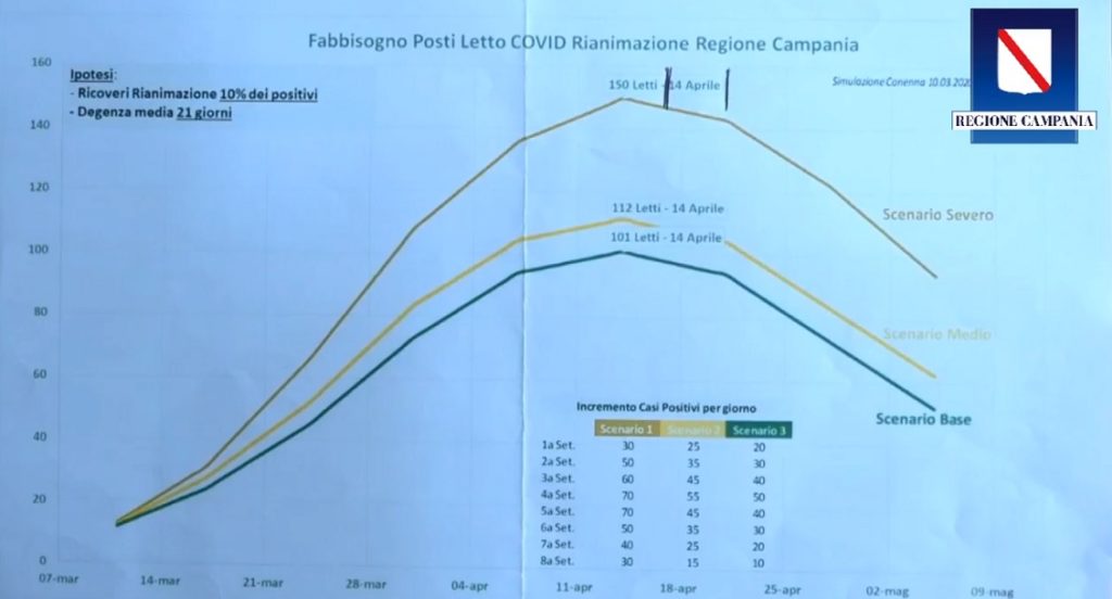 I TRE SCENARI – “Se la situazione resta quella attuale la riusciremo a governare. Se invece ci sarà un picco di contagi non ci faremo trovare impreparati” ha spiegato De Luca mostrando tre proiezioni diverse preparate dal direttore sanitario dell’ospedale Cotugno, centro riferimento regionale per il covid-19. “Prevediamo tre scenari: quello normale, quello di emergenza e quello grave. Facendo riferimento allo scenario grave noi avremo bisogno fino al 14 aprile, data dove poi è prevista una discesa dei contagi, dei posti letto che stiamo attrezzando per la prossima settimana”. Il rifermento è ai posti letto in terapia intensiva. Al momento i ricoverati al Cotugno in terapia intensiva sono 14. Il calcolo degli esperti della sanità campana è sulla base di dieci volte quello attualo, ovvero 150 posti letto.