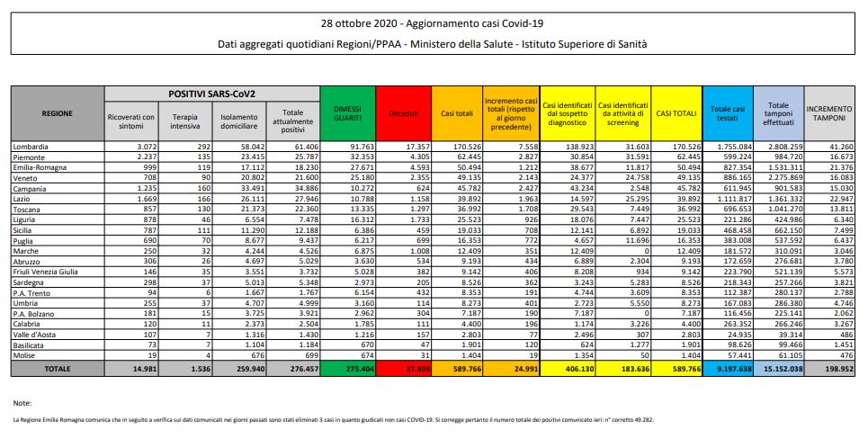 I tamponi processati nelle ultime 24 ore sono stati 198.952 tamponi, nuovo record nazionale, (15.152.038test sono stati analizzati dall’inizio del monitoraggio) col tasso di positività che si attesta al 12,6%. Sono invece 3.416 i guariti di oggi, 275.404 dall’inizio del monitoraggio, mentre il numero complessivo dei casi in Italia ha raggiunto la cifra di 589.766.